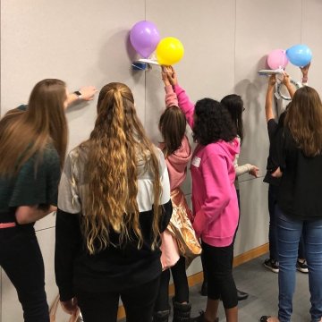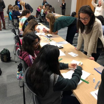 ENGEO reminisced on our early teen years and shared with 6th, 7th, and 8th grade students what made them want to become engineers at the inaugural Girls Lead the Way STEM (Science, Technology, Engineering, and Math) Summit last week. The half-day, all-female summit welcomed 100 girls from six local middle schools, and 50 volunteers of women from various STEM related companies. The morning kicked off with a presentation from key note speaker, Lt. Colonel Olga Custodio, USAF, the first Latina to complete USAF military pilot training, break the sound barrier, and become a USAF pilot. After Olga’s inspirational story, the students split into groups where our ENGEO team of volunteers greeted them and assisted with two hands-on activities.